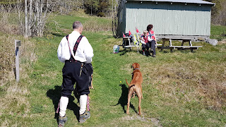 MrJ dukker så opp med sin herrebunad på, og som mor og gut, med fjellsko. 2 hunder har han også med, 2 hunder mor syns er så kjekke å ha med på tur.