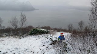 Så pass langt nede at det er ingen snø lengre. Det flotteste treet i heile skogen, det gamle store treet. Lillemann kikker opp. Så stort det er! Langt opp i himmelen! Tenk å hatt trehytte opp i den der, og sovet der? Og dermed er lillemann vekk i en historie om hyttebygging og overnatting. Poff, så er gjengen nede att. Fått frisk luft, funnet snø, spist mat, laget snømann, snøballkrig og ikkje minst, lurt vinden som trudde den kunne holde denne gjengen inne ifra tur ;-)